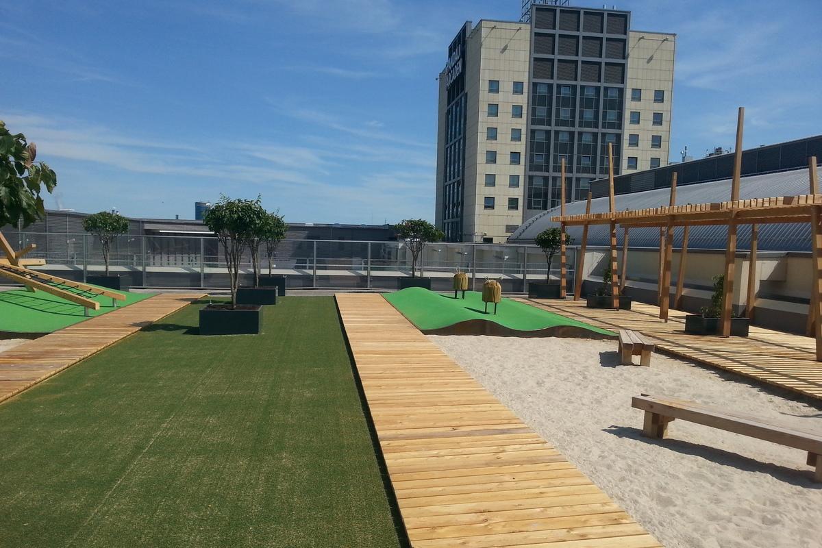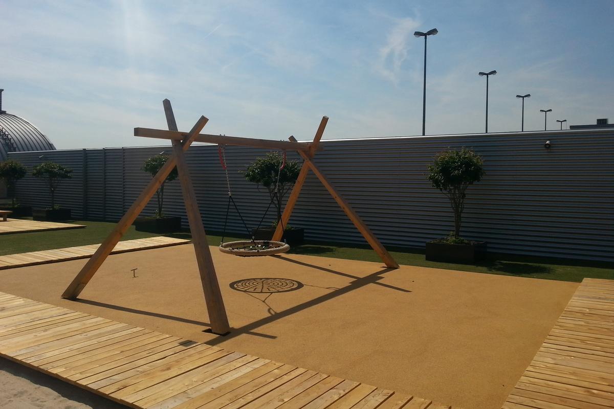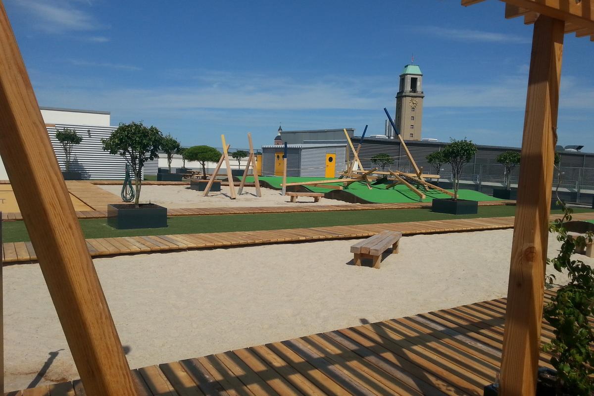 Wichtiger Bestandteil des pädagogischen Konzepts der Kindergärten und Krippen von Klax ist es, durch eine Umgebung voller Anreize die Kreativität von Kindern zu fördern. So entstand auf dem Dach eines Einkaufzentrums in Berlin-Spandau 2013 ein Erlebnisspielplatz, bei dem auf einer welligen Bewegungsfläche die Kinder spielerisch ihren Gleichgewichtssinn trainieren. Die Wellenlandschaft besteht aus rund 450 Quadratmetern Fallschutzbelag Polytan FS in verschiedenen Formen und Dicken. Der stoßdämpfende und vor Kopfverletzungen schützende Belag wurde auf einem speziell angefertigten Unterbau angebracht. Alle weiteren Spielgeräte fügen sich nahtlos in die Konstruktion ein. Polytan Kunstrasen und große Kübelpflanzen runden die zum Toben und Entdecken einladende Umgebung der Kita „Karlsson vom Dach“ ab. Das Konzept stammt von Schirmer-Partner Landschaftsarchitekten, die Umsetzung erfolgte in Zusammenarbeit mit Rumpf Garten- und Landschaftsbau aus Rampe bei Schwerin.